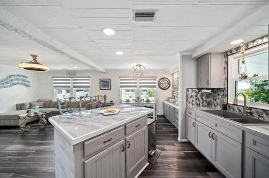 FULLY REMODELED & MINI GREEN for PETS at this 2 bed/2 bathroom beauty where SAFETY FEATURES merge w/ SOPHISTICATION. Don't miss this home which outshines the rest! BUILT FOR STRENGTH &SOPHISTICATION. LIST OF NEW Items includes but not limited to:DOUBLE HUNG, IMPACT WINDOWS w/ CUSTOM SHADES, SUBFLOORING w/ LUXURY VINYL PLANK FLOORS, DRYWALL, ENTIRE KITCHEN, APPLIANCES, ENTIRE MASTERBATH, Pantry w/ PULL-OUT drawers, CUSTOM DOORS, HAND CRAFTED STONE MIRROR. Fully enclosed Florida Rm doubles as den/extra bedroom/home office. AC 2020. ROOF Painted & SEALED 2024. Fireplace & 60''TV STAY. Stone Patio perfect for lounging/hosting & Grass area perfect for PUPS! Active 55 + community - Lot Lease of 765 incl trash, Clubhouse, fitness, game room, pool, hot tub, library, billiards & more!