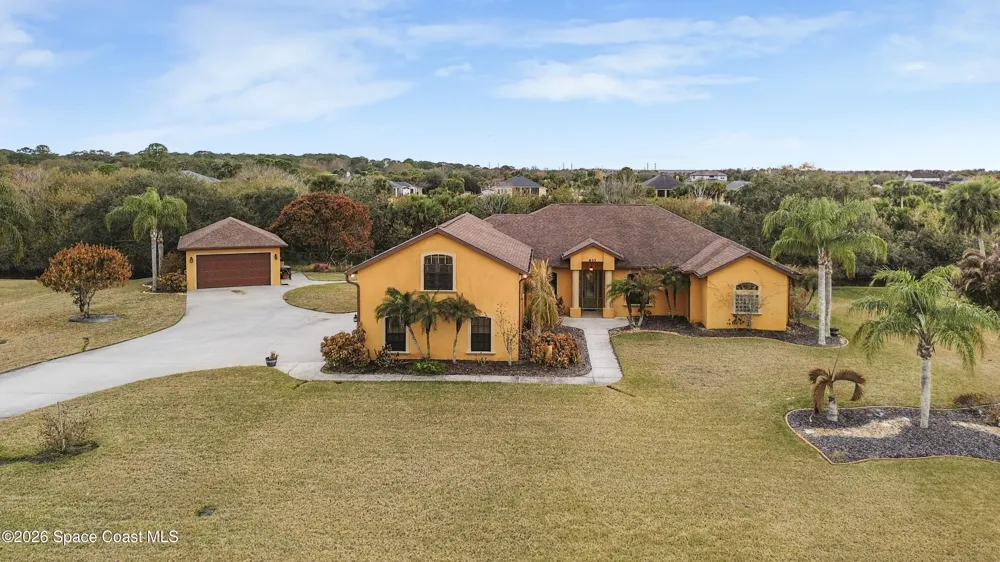 Situated on a full acre in the gated community of Rockledge Acres Estates, this 4-bedroom, 3-bathroom home offers space, privacy, and long-term pride of ownership, with only one owner in over 20 years. The home features tile flooring throughout the main living areas and wood flooring in the guest bedrooms and primary suite. A spacious kitchen opens to a separate dining area, ideal for holiday gatherings and entertaining. An upstairs loft with its own bathroom and closet provides flexible space for an entertainment room, guest suite, or home office. The primary suite includes his-and-her walk-in closets, dual tiled showers, and a jetted jacuzzi tub. Additional highlights include a three-car garage and a detached garage perfect for boat storage or extra vehicles. This rare property combines acreage, functionality, and gated community living in a highly desirable Rockledge location.